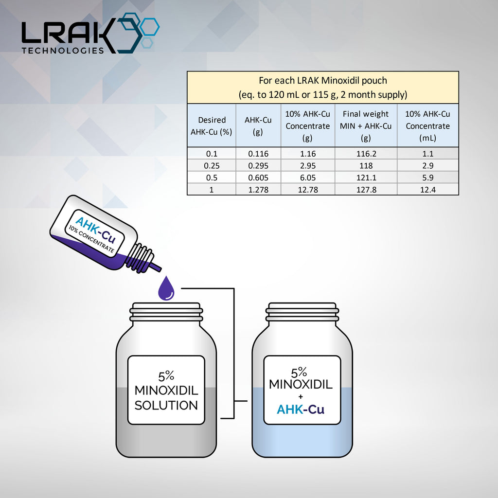 Add your preferred volume or weight of AHK-Cu solution to your existing minoxidil bottle (or pouch) and shake gently to combine. Apply your customised formula twice daily as usual.